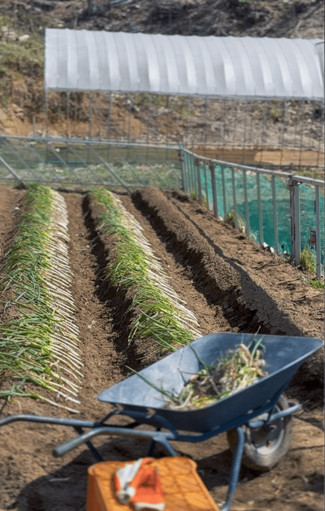 玉ネギはすでに仕込み済。ジャガイモなどの根菜も育てます。