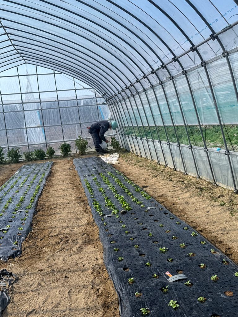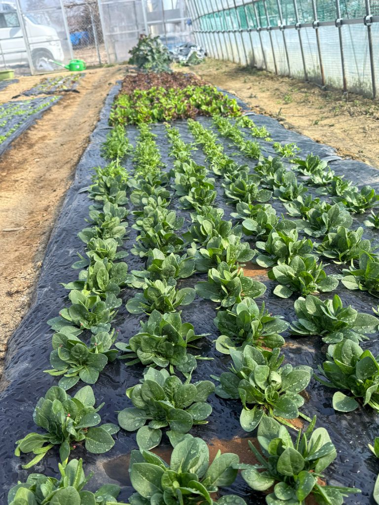 植え付け完了。ハウスの中だけで11種類の葉野菜が揃いました。